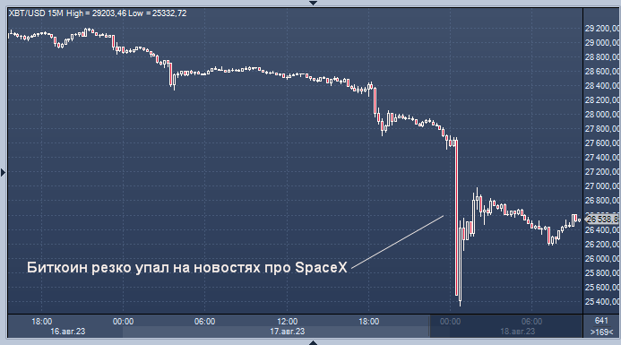 Падение биткойна последовало через несколько часов после того, как The Wall Street Journal сообщил, что SpaceX, которой руководит Илон Маск, списала стоимость своих активов в биткойнах на общую сумму 373 миллиона долларов в 2022 и 2021 годах, и что компания, занимающаяся космическими путешествиями, продала виртуальную валюту. Из отчета WSJ неясно, когда SpaceX продала свой биткойн.