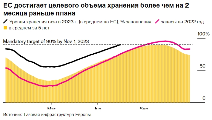 ЕС достигает целевого объема хранения более чем на 2 месяца раньше плана. Источник: Газовая инфраструктура Европы.