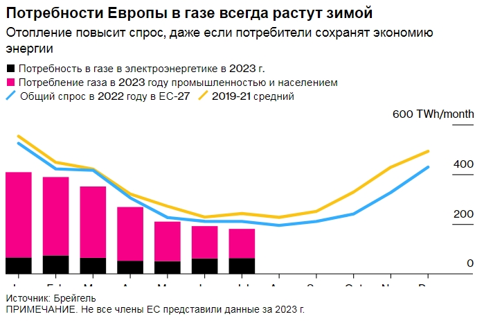 Потребности Европы в газе всегда растут зимой. Отопление повысит спрос, даже если потребители будут экономить. Источник: Bruegel