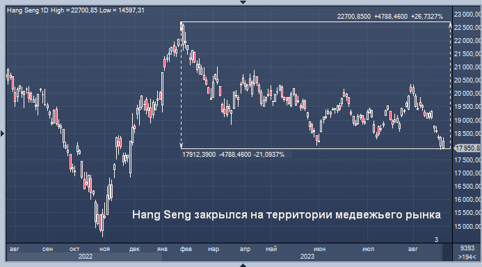 Базовый фондовый индекс Гонконга закрылись на территории медвежьего рынка, снизившись на 2,1% на сессии в пятницу и более чем на 20% ниже максимумов января, поскольку неопределенность в отношении рынка недвижимости Китая и перспектив роста экономики сводит на нет успехи, достигнутые в начале года.