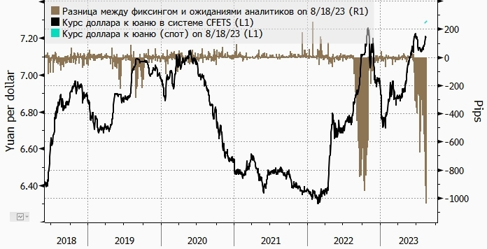 Власти усиливали поддержку юаня в течение прошлой недели, но курс продолжал падать как на внутреннем, так и на внешнем рынке. Источники Bloomberg сообщали, что власти потребовали от государственных банков усилить интервенции в поддержку юаня. Также ЦБ Китая заявил в четверг, что будет решительно предотвращать чрезмерные колебания курса валюты.