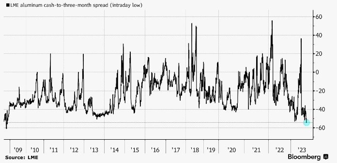 Спот-цена алюминия последнее время торгуется с самой большой скидкой по сравнению с контрактами с более поздней датой за последние 15 лет, что дает трейдерам или банкам возможность получать гарантированную прибыль, покупая и храня металл.