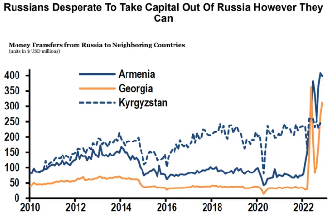 Проблемная экономика России также привела к массовому оттоку рабочей силы, ученых и олигархов, бежавших из страны, что может стать смертным приговором для ее долгосрочного экономического роста. Деньги бегут и теперь текут в соседние страны, такие как Армения, Грузия и Кыргызстан.