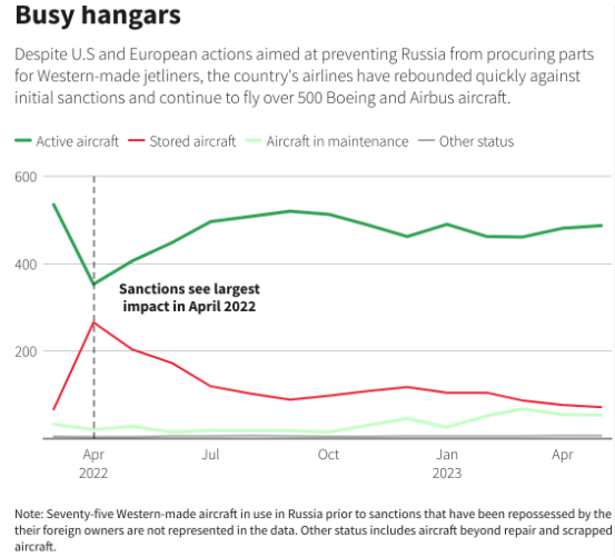 Но по состоянию на 1 мая этого года у российских перевозчиков был 541 западный самолет, находящийся в активной эксплуатации или на техническом обслуживании, согласно данным, собранным швейцарским поставщиком авиационной разведки ch-aviation. Это более или менее соответствует довоенному уровню, принимая во внимание 75 самолетов, арендованных российскими авиакомпаниями, которые были возвращены их иностранным владельцам, свидетельствуют данные ch-aviation.