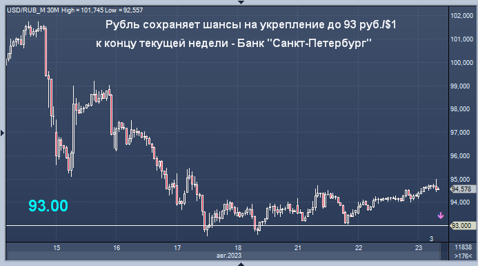 Рубль сохраняет шансы на укрепление в сторону уровня 93 руб./$1 до конца текущей недели на фоне вероятного усиления влияния фактора налогового периода с четверга, считают аналитики банка "Санкт-Петербург".