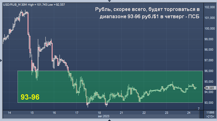 "Полагаем, что волатильность и активность спекулятивного капитала на валютном рынке несколько возрастет в четверг, что заставляет нас расширить диапазон вероятных колебаний курса доллара. Учитывая приближение налоговых выплат (28 августа), по-прежнему склонны ждать увеличения предложения валют со стороны крупных игроков и ухода доллара в ближайшей перспективе в более низкий ценовой диапазон (90-93 руб./$1), выглядящий, с нашей точки зрения, целевым в рамках текущего движения", - пишет представитель Промсвязьбанка Евгений Локтюхов.