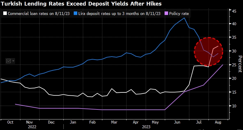 Неожиданный шаг оставил учетную ставку на самом высоком уровне с 2019 года и отправил турецкую валюту на самый высокий уровень с середины июля. С июня банк повысил свою недельную ставку репо на 1650 базисных пунктов.