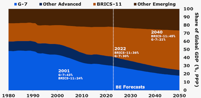 Мы видим, что страны БРИКС-11 почти удвоили свою долю в мировом ВВП в период с 2001 по 2040 год, фактически поменявшись местами с G-7, в которую входят Канада, Франция, Германия, Италия, Япония, Великобритания и США. Доля стран БРИКС-11 уже больше — 36% по сравнению с 30% в G-7 в прошлом году. Только в странах БРИКС этот показатель составляет 32%.