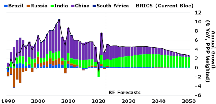 Вместе Бразилия, Россия, Индия, Китай и Южная Африка — иначе известные как БРИКС — опередили крупнейшие страны с развитой экономикой по доле мирового ВВП, чему способствовали десятилетия впечатляющего роста экономики в Китае. В то время как китайский двигатель, возможно, дает сбой, прогнозы Bloomberg Economics подразумевают, что Индия будет набирать обороты и увеличит долю БРИКС более чем до 40% мирового ВВП к 2040 году по сравнению с 32% в прошлом году.