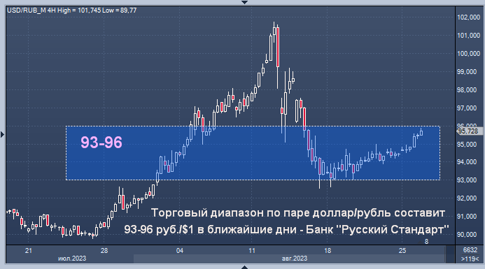 А торговый диапазон по паре евро/рубль составит 101,5-104,5 руб./EUR1, считает представитель "Русского Стандарта" Максим Тимошенко. Рубль поддержат позитивные новости по восстановлению соотношения экспорта и импорта и последующее за ним увеличение потока поступающей в страну валюты.