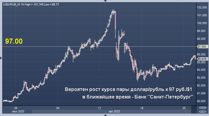 В последние месяцы после завершения налогового периода рубль показывал существенное ослабление из-за снижения предложения валюты. Если достигнутые недавно с экспортерами договоренности не предполагают равномерную продажу валютной выручки в течение месяца, в ближайшее время курс USD/RUB может расти к 97 руб./$1", - сообщили в банке "Санкт-Петербург"