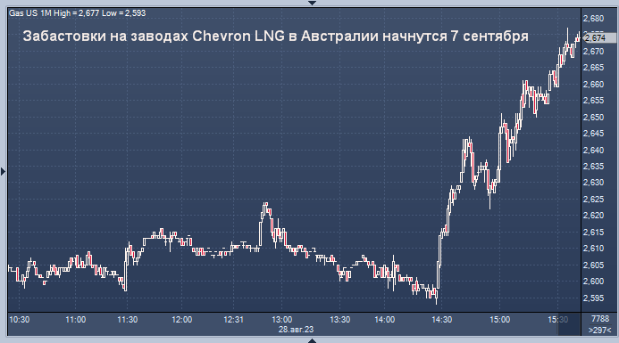 Цены на газ как в Европе, так и в США, ускорили рост после сообщений о предстоящих забастовках. Компания Chevron LNG в получила уведомление о том, что забастовки на ее заводах по экспорту сжиженного природного газа в Австралии начнутся с 7 сентября, если компания не достигнет соглашения с работниками, согласно заявлению компании.