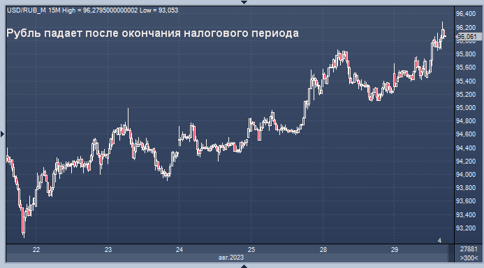 Как отмечают эксперты "Интерфакс-ЦЭА", рубль дешевеет в основных парах в ходе дневных торгов вторника после завершения налоговых выплат августа и снижения спроса на рублевую ликвидность со стороны компаний-экспортеров. На понедельник, 28 августа, пришелся единый день уплаты налогов, и они перечислили в бюджет НДС, страховые взносы, НДФЛ, НДПИ и акцизы.