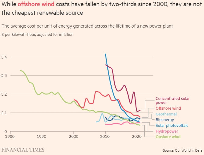 По данным Международного агентства по возобновляемым источникам энергии, получение большего количества электроэнергии от каждой турбины помогло снизить затраты на энергию ветра на 60 процентов в течение десятилетия до 2021 года.