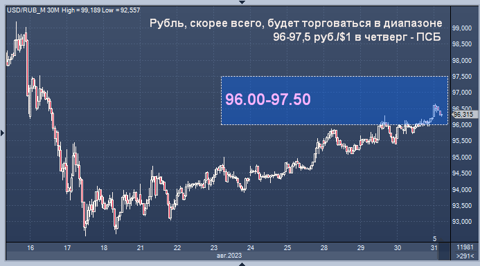 Ждем, что в четверг курс доллара попытается достичь отметки 97 руб./$1. Диапазон вероятных колебаний американской валюты на день - 96-97,5 руб./$1", - пишет аналитик Промсвязьбанка (ПСБ) Евгений Локтюхов.