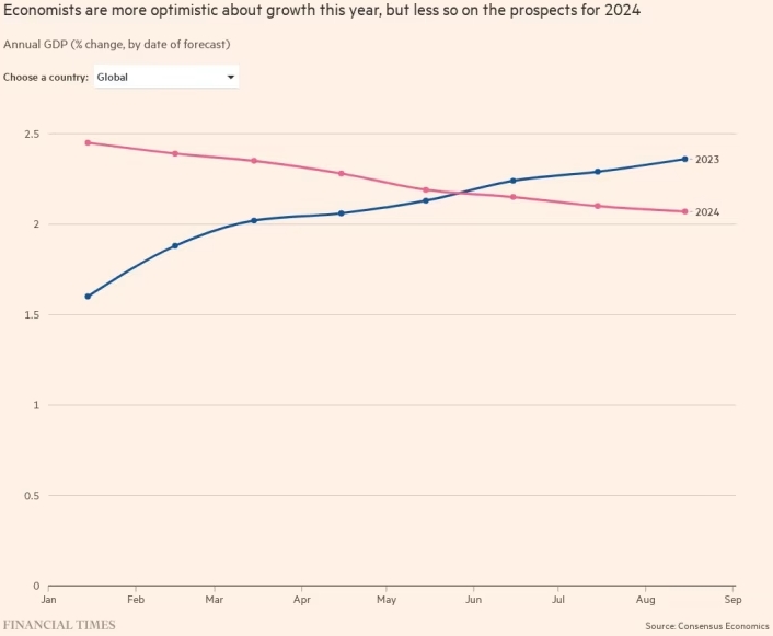 Продолжительное сохранение процентных ставок на высоком уровне в крупнейших экономиках означает, что глобальный экономический рост, вероятно, замедлится в следующем году после того, как в 2023 году темпы роста превзойдут ожидания, говорят экономисты.