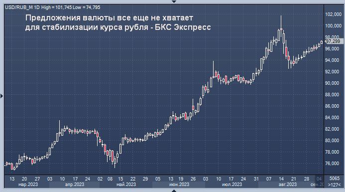 Предложения валюты на рынке пока все еще не хватает для стабилизации курса рубля, считает аналитик БКС Экспресс Василий Карпунин.
