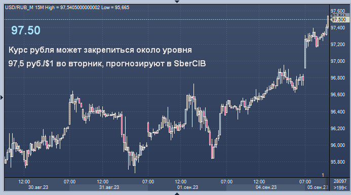 Курс рубля может закрепиться около уровня 97,5 руб./$1 во вторник, прогнозируют в Сбербанке. Аналитики отмечают, что в понедельник обороты торгов на валютном рынке сократились, и это говорит о том, что продажи иностранной валюты экспортерами снизились, несмотря на рост цен на нефть.