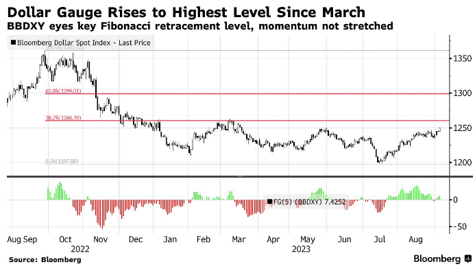 Спотовый индекс доллара Bloomberg во вторник поднялся на 0,5%, увеличив свой рост с середины июля до 4,5%. Подъем был резким и устойчивым: в последнее время валюта росла семь недель подряд, что является самым продолжительным ростом с 2018 года.