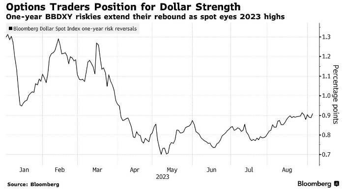 Трейдеры опционов также настроены на дальнейшее укрепление. Риск-развороты по однолетним опционным контрактам на индекс доллара от Bloomberg, барометр рыночных настроений в долгосрочной перспективе, находятся вблизи самых бычьих уровней с апреля.