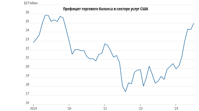 Более того, США являются лидером экспорта в одной крупной области — это сфера услуг, и здесь все пока тоже не очень хорошо. Дефицит торговли товарами в июле составил $90 млрд, а торговый профицит в сере услуг — $25 млрд, что все равно ниже, чем в 2019 году с поправкой на инфляцию.