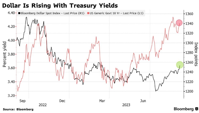 Спотовый индекс доллара Bloomberg находится на пути к росту восьмую неделю подряд, что станет самым продолжительным периодом роста, начиная с 2005 года. Признаки того, что экономика США движется к мягкой посадке, подтверждают взгляды на то, что ФРС будет поддерживать высокие затраты по займам на более длительный срок, что повысит привлекательность доллара.