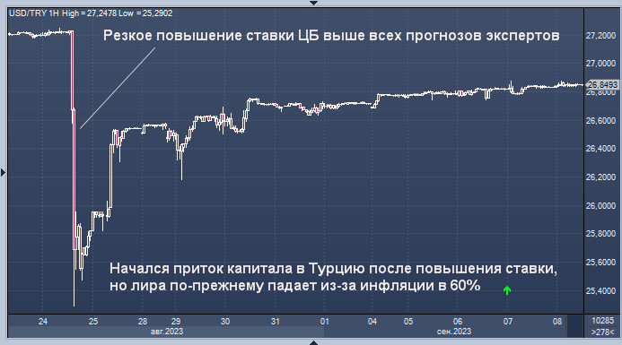 Некоторые иностранные инвесторы закрыли короткие позиции в турецких облигациях после того, как центральный банк поднял ставку на 750 базисных пунктов до 25% в августе и дал понять, что в будущем повысит ее еще больше, говорят трейдеры. Между тем, приток иностранного капитала в турецкие акции стал положительным после трех недель оттока. Иностранцы приобрели акции на общую сумму 254 миллиона долларов за неделю, закончившуюся 1 сентября, когда базовый индекс Стамбульской фондовой биржи достиг рекордного уровня.