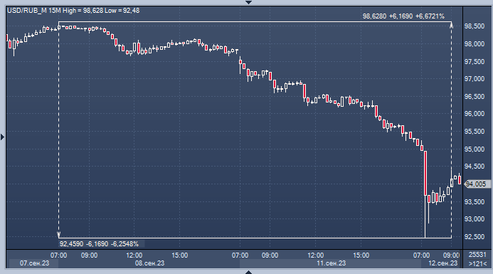 Курс доллар/рубля на Мосбирже интервалами в 1 минуту