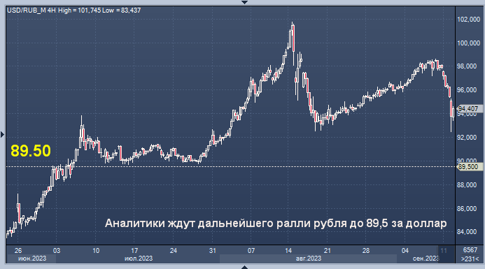 "По паре USD/RUB ближайшим ориентиром снизу выступают те уровни, с которых в августе началась очередная волна роста - это район около 92,5 руб./$1. Если и этот рубеж в перспективе будет пройден вниз, то далее цель сместится к 89,5-90 /$1", - считает аналитик.