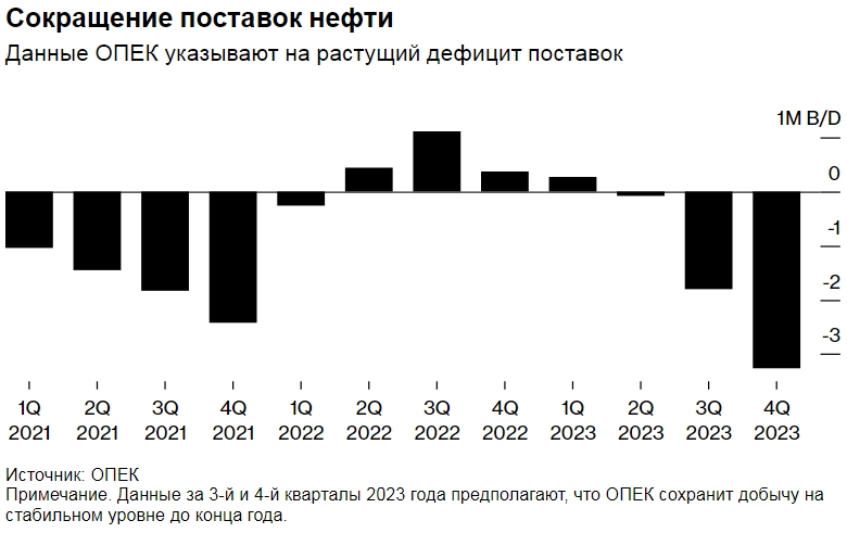 Сокращение поставок нефти. Данные ОПЕК указывают на растущий дефицит поставок. Источник: ОПЕК. Примечание. Данные за 3-й и 4-й кварталы 2023 года предполагают, что ОПЕК сохранит добычу на стабильном уровне до конца года.