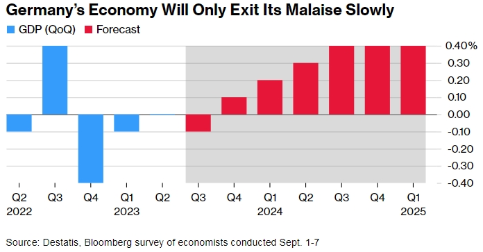 Факторы, сдерживающие Германию, включают слабый спрос со стороны Китая, нехватку квалифицированной рабочей силы и затяжные последствия энергетического кризиса в сочетании с устойчивой инфляцией, которая ограничивает внутренний спрос.