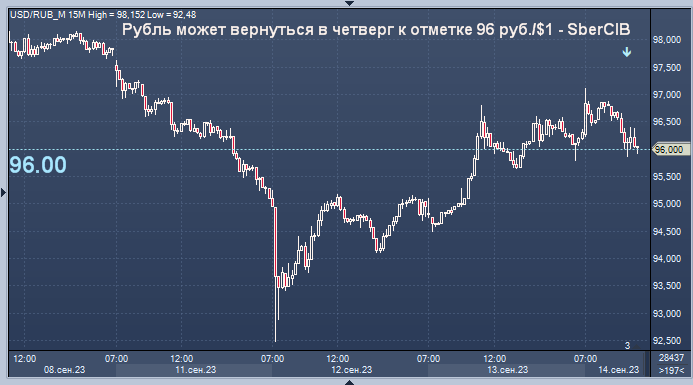 "Рубль в четверг утром подешевел до 96,7 руб./$1. В течение дня Банк России увеличит продажи юаней в девять раз до 21,4 млрд руб. Повышенные продажи продолжатся до 15 сентября. Они должны компенсировать дополнительный спрос на валюту, который возникнет в пятницу в связи с погашением в рублях еврооблигаций Россия-23 в объёме $3 млрд. В последнее время торговые и финансовые потоки заметнее всего влияют на обменный курс в тот момент, когда они происходят фактически (а не тогда, когда о них становится известно заранее), поэтому мы считаем, что в четверг рубль может вернуться к 96 руб./$1", - пишут аналитики SberCIB.