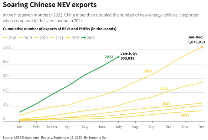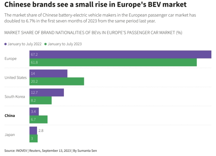 Большинство автомобилей и аккумуляторов, от которых они питаются, предназначались для Европы, где в 2022 году 16% проданных аккумуляторов и транспортных средств были произведены в Китае.