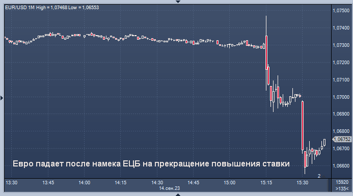 Евро упал до недельного минимума по отношению к доллару, в то время как немецкие облигации выросли после того, как Европейский центральный банк поднял процентные ставки на 25 базисных пунктов до 4% и дал понять, что ставки достигли уровня, который внесет «существенный вклад» в сдерживание инфляции. Пара EUR/USD снизилась на 0,58% до 1,0666 по сравнению с 1,0752 ранее. Доходность 10-летних облигаций Германии упала на 7 б.п. до 2,58%; Денежные рынки делают ставку на повышение на 3 базисных пункта к концу года.