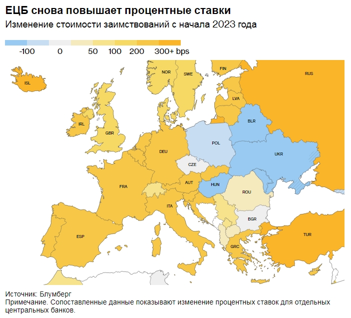 Жесткое решение ЕЦБ повысить ставку по депозитам в 10-й раз подряд, на 25 базисных пунктов до 4 процентов в четверг, было принято после того, как официальные лица сократили свои прогнозы роста экономики еврозоны.