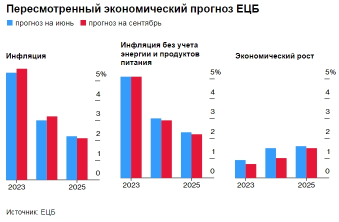 Европейский центральный банк повысил оценку инфляционных ожиданий на 2023 и 2024 годы, но понизил оценки базовой ставки на будущие годы. Сотрудники Евросистемы теперь ожидают, что инфляция составит 5,6% в 2023 году, 3,2% в 2024 году и 2,1% в 2025 году, что пересмотрено с 5,4%, 3,0% и 2,2% соответственно согласно предыдущим прогнозам, сделанным в июне. Однако прогнозы базовой инфляции, которые исключают волатильность цен на продукты питания и энергоносители, были пересмотрены до 5,1%, 2,9% и 2,2% на 2023, 2024 и 2025 годы с 5,1%, 3,0% и 2,3% соответственно, сообщает ЕЦБ.