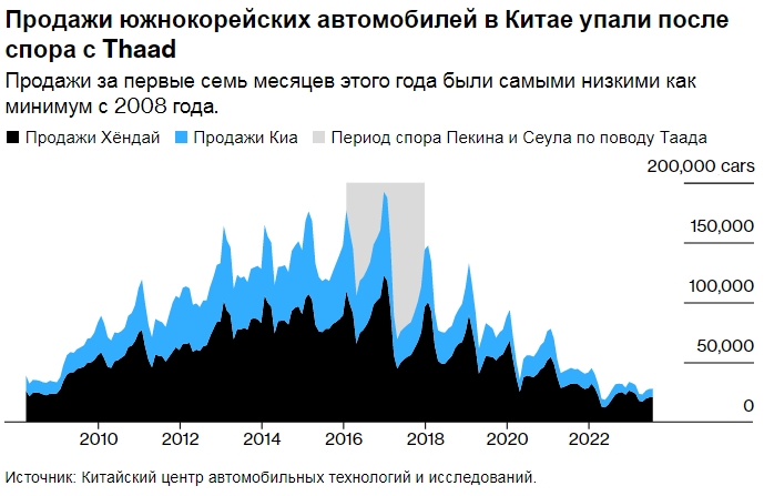 Продажи южнокорейских автомобилей в Китае упали после спора с Thaad. Продажи за первые семь месяцев этого года были самыми низкими как минимум с 2008 года. Источник: Китайский центр автомобильных технологий и исследований.