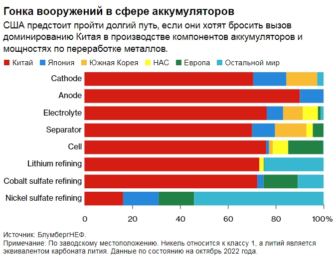 Гонка вооружений в сфере аккумуляторов. США предстоит пройти долгий путь, если они хотят бросить вызов доминированию Китая в производстве компонентов аккумуляторов и мощностях по переработке металлов. Источник: Блумберг. Примечание: По заводскому местоположению. Никель относится к классу 1, а литий является эквивалентом карбоната лития. Данные по состоянию на октябрь 2022 года.