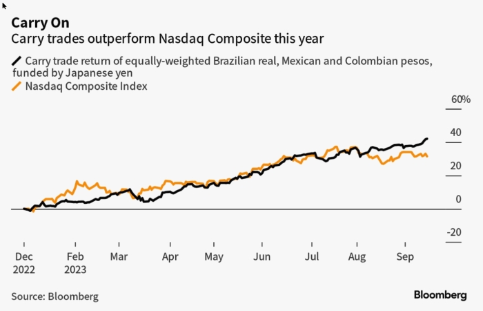 Конечно, есть множество предостережений. Никто не говорит о том, что carry trade в иене прекратился или что спекулянты отказываются от иены в пользу юаня. До сих пор в этом году финансирование покупок в иенах в Латинской Америке, где базовые ставки достигают 13,25%, было особенно выгодным. Равновесная корзина реалов, колумбийских и мексиканских песо выросла на 42%, легко превзойдя рост индекса Nasdaq.