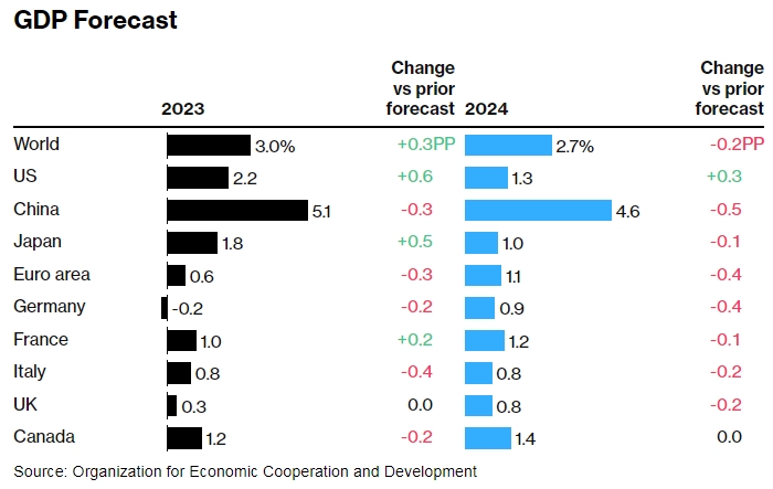 Углубляясь в региональные и страновые перспективы, она сократила свои прогнозы роста еврозоны на этот и следующий год, прогнозируя сокращение на 0,2% в Германии в 2023 году, что делает ее единственной страной G-20, за исключением Аргентины, которая перенесет спад. Хотя экономический рост в США будет сильнее, чем прогнозировалось в июне, он замедлится до 1,3% в 2024 году с 2,2% в 2023 году.