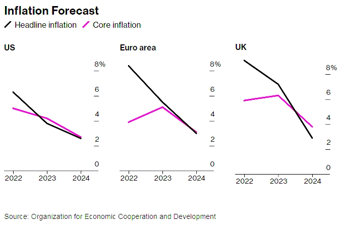 ОЭСР предостерегает от смягчения политики, поскольку базовые цены продолжают расти во многих странах, даже несмотря на то, что основные показатели снижаются. Возможности для снижения ставок ограничены до «наступления 2024 года», говорится в сообщении.
