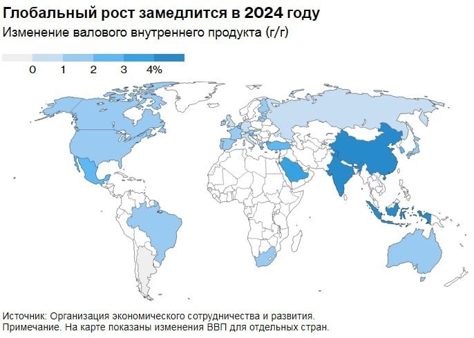 Глобальный рост замедлится в 2024 году. Изменение валового внутреннего продукта (г/г). Источник: Организация экономического сотрудничества и развития.Примечание. На карте показаны изменения ВВП для отдельных стран.