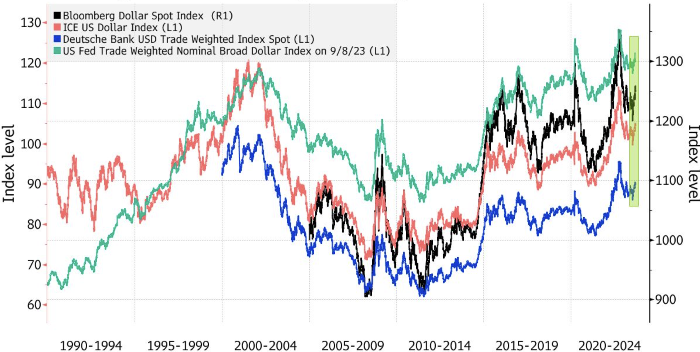 После рекордного восьминедельного роста, начавшегося в середине июля, индекс доллара Bloomberg Dollar Spot Index вернулся к максимумам этого года. Однако пока он все еще ниже прошлогодних максимумов, что делает последствия более мягкими, чем в 2022 году. Тогда резкий рост USD усилил инфляционное давление во всем мире, повысив стоимость сырьевых товаров, цена на которые устанавливается в американской валюте.