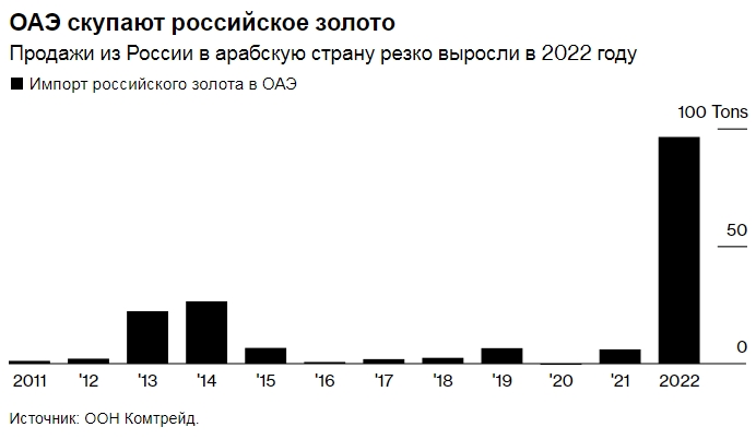 Согласно базе данных Comtrade ООН, в прошлом году ОАЭ импортировали 96,4 тонны золота из России, больше, чем любая другая страна. Это примерно треть годовой добычи золота в России и более чем 15-кратное увеличение годового импорта золота в ОАЭ из страны.