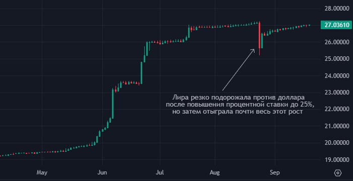 24 августа эта ставка была повышена до 25% с 17,5%, и данное событие спровоцировало резкий, но непродолжительный рост турецкой валюты. К настоящему моменту почти весь этот рост уже отыгран, и еще одно неожиданное значительное повышение базовой ставки (т. е. выше 30%) вряд ли спровоцирует столь же масштабное укрепление лиры, полагает главный экономист HSBC Asset Management Turkey Ибрагим Аксой. По его словам, большой объем коротких позиций по турецкой валюте был закрыт после августовского повышения ставки, вследствие чего «топлива» для аналогичного роста лиры осталось значительно меньше.