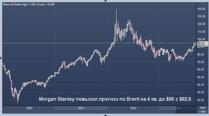 Morgan Stanley повысил свои прогнозы цен на нефть марки Brent, заявив, что рынок может оставаться дефицитным в течение нескольких кварталов, особенно после сокращения добычи Саудовской Аравией и Россией, но сказал, что цены выше 100 долларов за баррель будут казаться "натянутыми".