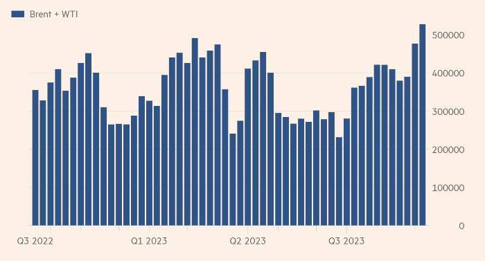 Эти цифры, сопоставимые с более чем 500 млн баррелей или примерно пятидневным мировым спросом, свидетельствуют об активности спекулятивных игроков, таких как хедж-фонды. Оле Хансен, глава отдела Saxo Bank по стратегиям на сырьевых рынках, отметил, что интерес хедж-фондов к нефти восстановился после того, как Саудовская Аравия в начале месяца объявила о том, что она будет обеспечивать добровольное ограничение добычи дольше, чем предполагалось ранее.