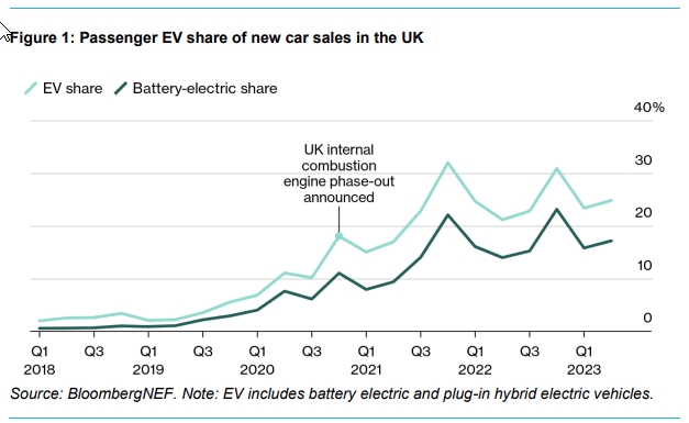 Премьер-министр Риши Сунак объявил 20 сентября, что Великобритания отложит до 2035 года свою амбициозную цель, ранее установленную на 2030 год — запретить продажи автомобилей с двигателями внутреннего сгорания. Согласно предыдущему плану, новые автомобили и фургоны, работающие только на бензине или дизельном топливе, не продавались бы в стране после 2030 года, но подключаемые гибриды все равно были бы разрешены еще в течение пяти лет. Новая дата приближает Великобританию к другим крупным рынкам электромобилей, включая Европейский Союз и Калифорнию. Но теперь у этих регионов, возможно, есть преимущество в гонке за электрификацией на фоне попутного ветра щедрых стимулов к покупкам — то, чему Великобритания положила конец в прошлом году.
