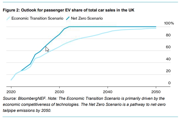 Анализ BNEF показывает, что продажи автомобилей с ДВС должны прекратиться в 2032 году, чтобы к 2050 году парк автомобильного транспорта Великобритании был равен нулю. Дата поэтапного отказа от 2035 года, скорее всего, позволит стране достичь этой цели вовремя, но в 2040-х годах потребуется более резкий рост продаж, чтобы не сбиться с намеченного курса. Однако из этого анализа становятся ясными две вещи: