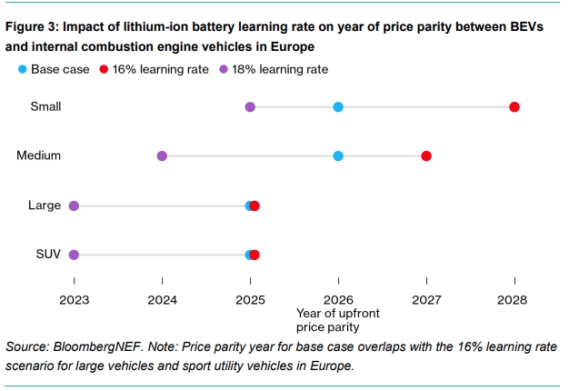 Исходя из текущей траектории снижения цен на аккумуляторные батареи, при наблюдаемом темпе роста на 17%, BNEF оценивает, что паритет первоначальных цен между электромобилями на аккумуляторах и автомобилями с ДВС на несубсидируемой основе будет достигнут уже в 2025 году для крупных транспортных средств и спортивных внедорожников в Европе и в 2026 году для малых и средних BEV. Если цены на аккумуляторы будут падать быстрее, с темпом 18%, то паритет может быть достигнут уже в 2023 году для некоторых сегментов. Если медленнее, с темпом 16%, паритет может быть достигнут позже для малых и средних автомобилей — уже к 2028 году, но останется неизменным для более крупных транспортных средств.